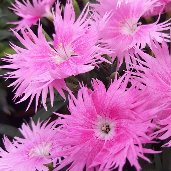 Гвоздика Супра (Dianthus interspecific Supra). Компактная межвидовая гибридная гвоздика с хорошим боковым ветвлением и крупными ажурными игольчатыми цветками до 4 см в диаметре.