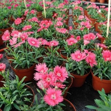 Гвоздика Супра (Dianthus interspecific Supra). Компактная межвидовая гибридная гвоздика с хорошим боковым ветвлением и крупными ажурными игольчатыми цветками до 4 см в диаметре.