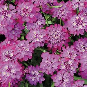Иберис зонтичный Пурпурный бархат. Ветвистое растение раскидистой формы, высотой 20-25 см. Душистые цветки собраны в плотные соцветия до 5 см диаметром. Цветет с июня в течение двух месяцев. Используют для сборных цветников, рабаток и бордюров.
