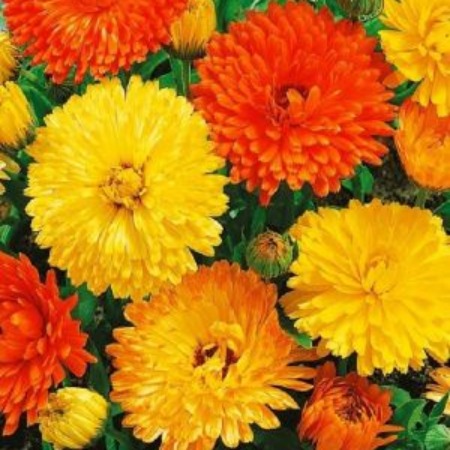 Календула Чародейка. Высокорослая смесь с соцветиями разнообразной окраски. Куст раскидистый, густоветвистый, высотой до 70 см. Соцветия крупные, диаметром 5-7 см, полушаровидные, махровые. Окраска ярко-оранжевая, желтовато-кремовая, светло-желтая. Используют для групп, рабаток, бордюров и срезки.