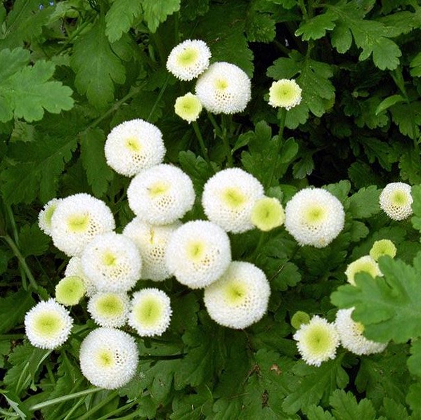 Хризантема девичья Сноу бол. Кустистое растение высотой до 25 см. Листья перисто-рассеченные, светло-зеленые. Белые соцветия - корзинки до 2 см в диаметре, похожи на подушечки. Цветет обильно и продолжительно в течение всего лета. Используют для посадки группами, на рабатках, в бордюрах.