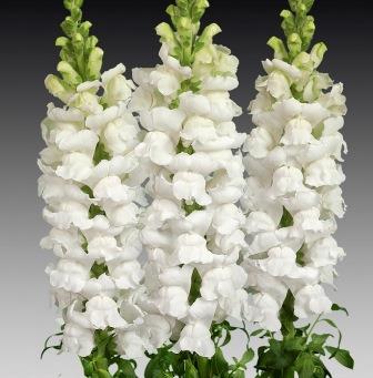 Львиный зев Белый букет. Куст высотой до 90 см. Цветки крупные, чистой белой окраски. Цветет с июня по октябрь. Продолжительность цветения одного цветка до 12 дней. Используют для клумб, рабаток, групповых и массовых посадок, миксбордеров, опушек к кустарникам, для срезки. В срезанном виде стоят в воде 7-14 дней, при этом распускаются все бутоны.