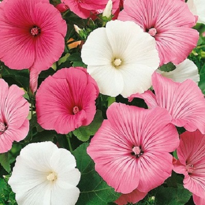 Лаватера Смесь окрасок. Великолепная смесь высокорослых сортов. Ветвистое растение, высотой 60-100 см, с воронковидными цветками ярко-белой, розовой и карминно-розовой окраски. Цветёт обильно с июля до осени, отцветшие цветки регулярно удаляют. Используют для клумб, как фокусное растение, хорошо смотрится в рядовых посадках и для срезки.