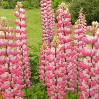 Люпин Чателайн. Растение высотой около 90 см. Листья красивые, пальчато-сложные, на длинных черешках. Кистевидные соцветия розового цвета. Цветение обильное в июне-июле. Используют для бордюров, рабаток, миксбордеров.