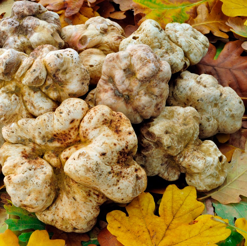 Трюфель белый - очень высоко ценимый деликатес. Считалось, что трюфели способны вернуть молодость и жизненную силу. Представляет собой редкий съедобный сумчатый гриб, который растет в земле на глубине 15-30 см поодиночке или группами с конца июля до начала ноября (при теплой погоде). Плодовое тело имеет неправильно сплюснутую или округлую форму, с волокнистой желтоватой или бурой поверхностью. Тело равномерно белое, мучнистое, как у картофеля, со временем становится мраморное, с прожилками, окруженными бесцветными ободками, в зрелом состоянии желтовато-бурое. Белый трюфель обладает самым изысканным вкусом и ароматом. Аромат свежего трюфеля очень сильный, это один из самых пахнущих продуктов в мире. Именно этот аромат принес трюфелям мировую известность. Места распространения — хвойные, особенно сосновые, и лиственные леса с участками глинистой и песчаной почвы. Наиболее ценные, высококачественные трюфели растут в орешнике. Произрастает в Тульской, Орловской, Смоленской, Владимирской, Московской областях. Раньше этот трюфель в больших количествах добывали в окрестностях Загорска и Александрова, причем урожай их совпадал с урожаем белых грибов.