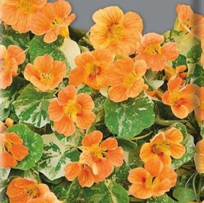 Настурция низкорослая Аляска Золотая. Куст компактный, прямостоячий, высотой до 40 см. Листья с белыми пятнами. Цветы золотистые, расположены поверх листьев. Цветет обильно с июля по октябрь. Используют для бордюров, рабаток, укрытия склонов, балконных ящиков.