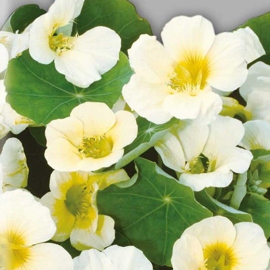 Настурция большая Йети. Интересная настурция с белыми цветами. Побеги длиной до 2 м. Шпорцы длинные, чуть изогнутые. Цветет обильно с июля до заморозков. Используют для вертикального озеленения, балконных ящиков.