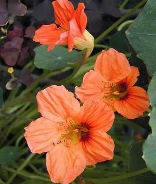 Настурция большая Лососевый блик. Обилие махровых цветов. Полустелющиеся побеги длиной до 1,5 м. Лососевые цветы с приятным ароматом. Шпорцы длинные, чуть изогнутые. Цветет обильно с июня до заморозков. Используют для вертикального озеленения, балконных ящиков.