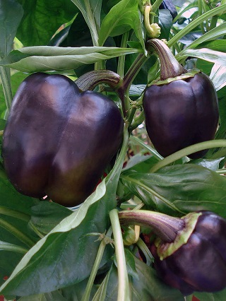 Перец сладкий Пурпурный колокол. Растение раскидистое, высотой в открытом грунте 70-80 см. Плод кубовидной формы, высота и диаметр 9-11 см, трех-четырехгранный, толщина стенок 6-7 мм. Окраска в технической спелости фиолетовая, в биологической - красная. Хорошая товарность. Хорошо завязывает плоды при перепадах температуры воздуха. Посев на рассаду в конце февраля - начале марта. В фазе 1-2 настоящих листьев сеянцы пикируют. В открытый грунт рассаду высаживают в конце мая - начале июня, когда минует угроза заморозков. Схема посадки 40x50 см.