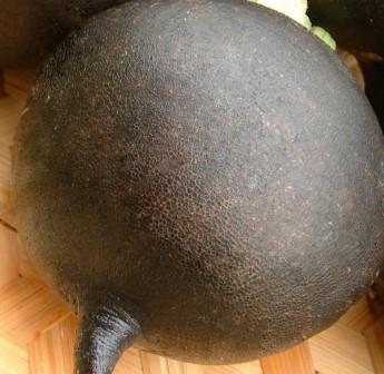 • Корнеплод округлой формы, короткий, диаметром 8-12 см. Кожица черная, головка округлая.