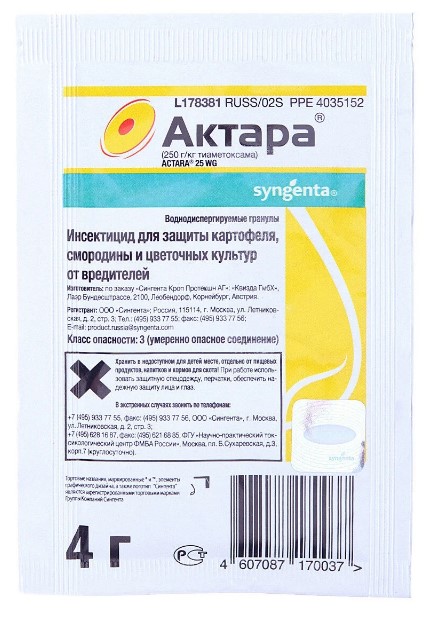 Инсектицидное средство "Актара" - для защиты культур от комплекса сосущих и листогрызущих насекомых,против колорадского жука на картофеле,от тли на смородине,от тли, трипса, белокрылки, щитовки и ложнощитовки, почвенных мушек и грибных комариков на горшечных цветочных растениях.
