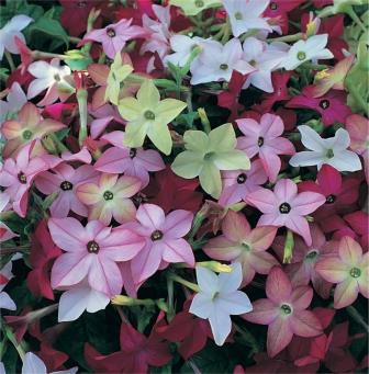Табак Душистый Сенсация. Растение высотой до 75 см. Великолепные цветовые сочетания цветков с дивным ароматом, который особенно чувствуется тёплым, летним вечером. Цветет с июня по октябрь. Используют группами на газонах, для оформления клумб и балконов.