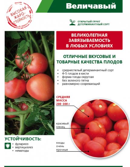 Томат Величавый - крупноплодный салатный сорт для открытого грунта. Среднераннего срока созревания. Растение детерминантного типа. 4-5 плодов в кисти. Форма плода округлая. Средняя масса 280-300 г. Без зеленого пятна. Предназначен для потребления в свежем виде.  Устойчив: фузариозу, вертицеллёзу.