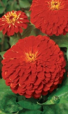Цинния георгиноцветковая Алое пламя. Пышное и нарядное цветение. Растение мощное, ветвистое от основания, высотой 80-90 см. Плотные полушаровидные соцветия, диаметром 8-10 см, красные. Цветет с июля по сентябрь. Используют для оформления цветников, рабаток и срезки.
