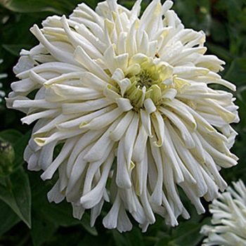 Цинния кактусовидная Снежный человек. Растение мощное, ветвистое от основания, высотой 70-75 см. Полушаровидные махровые соцветия, диаметром 10 см, кремово-белой окраски. Язычковые цветки узкие, свёрнутые по длине в трубочки, причудливо изогнуты. Цветет с июля по сентябрь. Широко используют для цветников и на срезку.